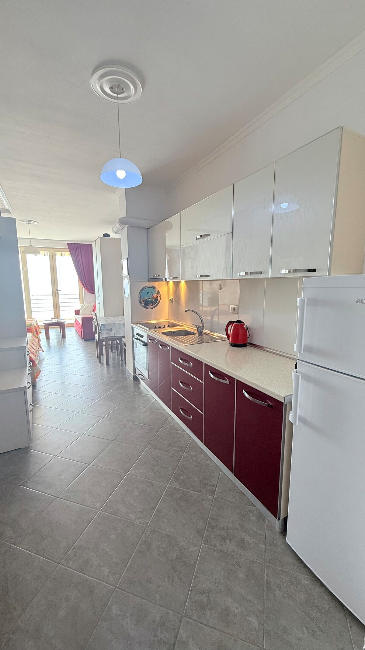 The apartment is located in Shëngjin. This apartment has a sea view, provides accommodation with free WiFi. The beach is just 40 m from the apartment and there you can find a lot of Restaurants and Bars. The area is most of the time quiet and relaxing. The city center is just a min walk from the apartment and there you can find different Bars, Restaurant, Blue mare is under the building which are more crowded and longer opened. Other Beaches like 'Rana e Hedhun ,Tale are just a minutes away.