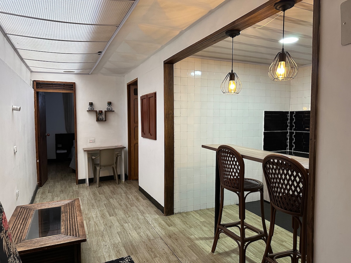 Apartaestudios con todas las comodidades Ideal para parejas, familias o grupo. Cocina, wifi, agua caliente, independiente, parqueadero privado. La ubicacion es excepcional, muy cerca al comercio y sobre la misma calle hay supermercado, farmacia, corresponsal bancario y tienda de ropa. Una zona muy central, tranquila y segura.