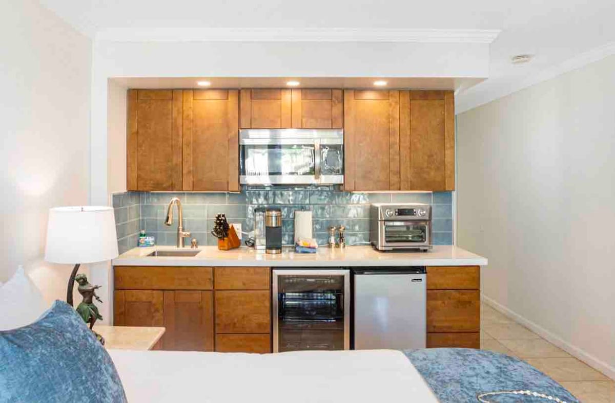 Thirty-five paces to sand in your toes, waves at your feet, and the sun to warm your senses. Your worries begin to melt away. The studio has everything to feel like home, a king bed, a newly remodeled expanded kitchenette, a new shower, dining for two, a loveseat, and a gas BBQ by the pool. Fresh linens, towels, and essentials. No children; only two adults are allowed, and no early check-in or luggage drop is permitted. Check-in is 3 pm, and checkout is 10 am.