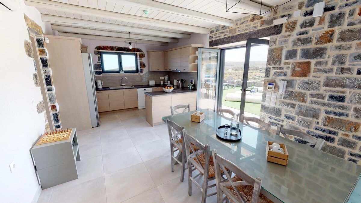 Welcome to stone villa in Gournes, near Heraklion! It’s a two-story stone-built Villa that can host up to 6 people, in 2 double bedrooms and one walk through bedroom with two singles on the upper floor, where there is also a bathroom. On the ground floor there is a spacious living room, dining room, a fully equipped kitchen and a second bathroom. On the villas exterior there is a swimming pool, sunbathing area, fully equipped BBQ pod and an outdoor dining table surrounded by a boho ambience.