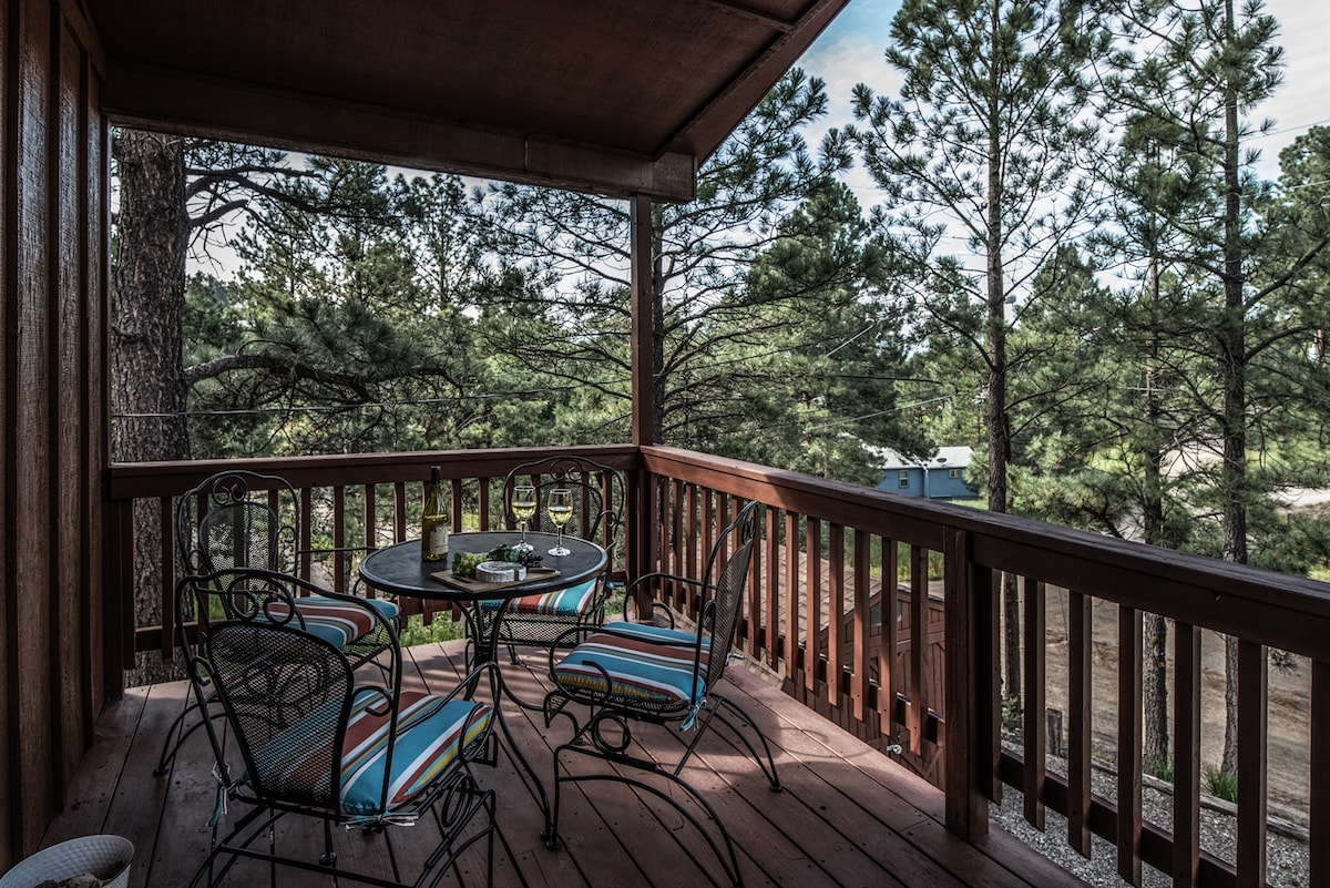 Peaceful mountain cabin located 1 minute away from Midtown Ruidoso's shopping, dining, and activities. This 1942 cabin offers two bedrooms and one bath as well as a spacious outdoor deck, kitchen, and living room. Private but close to town. Elk, deer & wild turkey are abundant on our acre lot and in perfect view from the cabin deck. This quiet oasis offers Wi-Fi, a propane fire pit, electric fireplace as well as coffee, hot chocolate, and oatmeal. You'll feel miles away but still close to town.