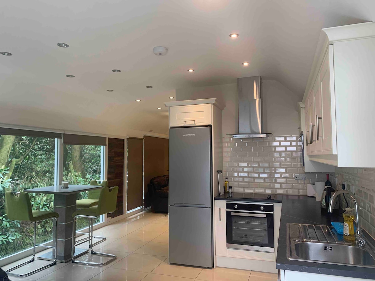 Beautiful garden annex, fully equipped with the luxury of a five star hotel but with the serenity of a retreat experience. This suite consists of three interconnecting bedrooms, kitchenette and bathroom situated in a scenic countryside setting. Large garden with lots of outdoor seating and plenty of space for kids to play football, jump on the trampoline etc. No matter what season you visit Spruce lodge it has something great to offer, be it the garden in full bloom during Summer, the gorgeous Autumnal colours of Autumn, the warm romantic Winter evenings by the open fire or the awakening of nature in Spring with the dawn chorus, you won't be disappointed.