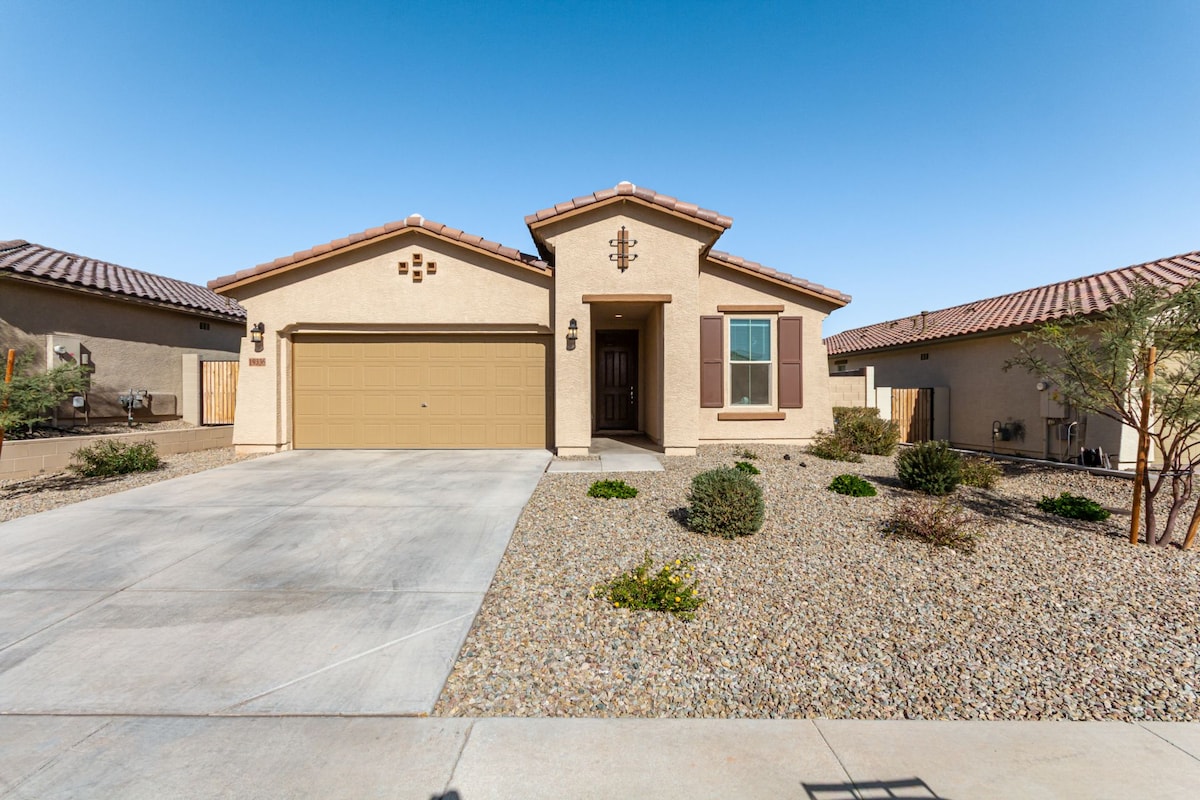 Our home sleeps four comfortably, with space for up to seven. Enjoy a king bedroom, queen bedroom, and office with a futon. A queen air mattress is available upon request prior to arrival. Two full bathrooms. Fully equipped kitchen with a smart fridge and Nespresso machine with pods, 60” TV, and a private backyard with patio. High speed 450 Mbps WiFi with 5G coverage included. Short drive to Camelback Ranch and Goodyear Ballpark, and 10 minutes to State Farm Stadium. Self check in.