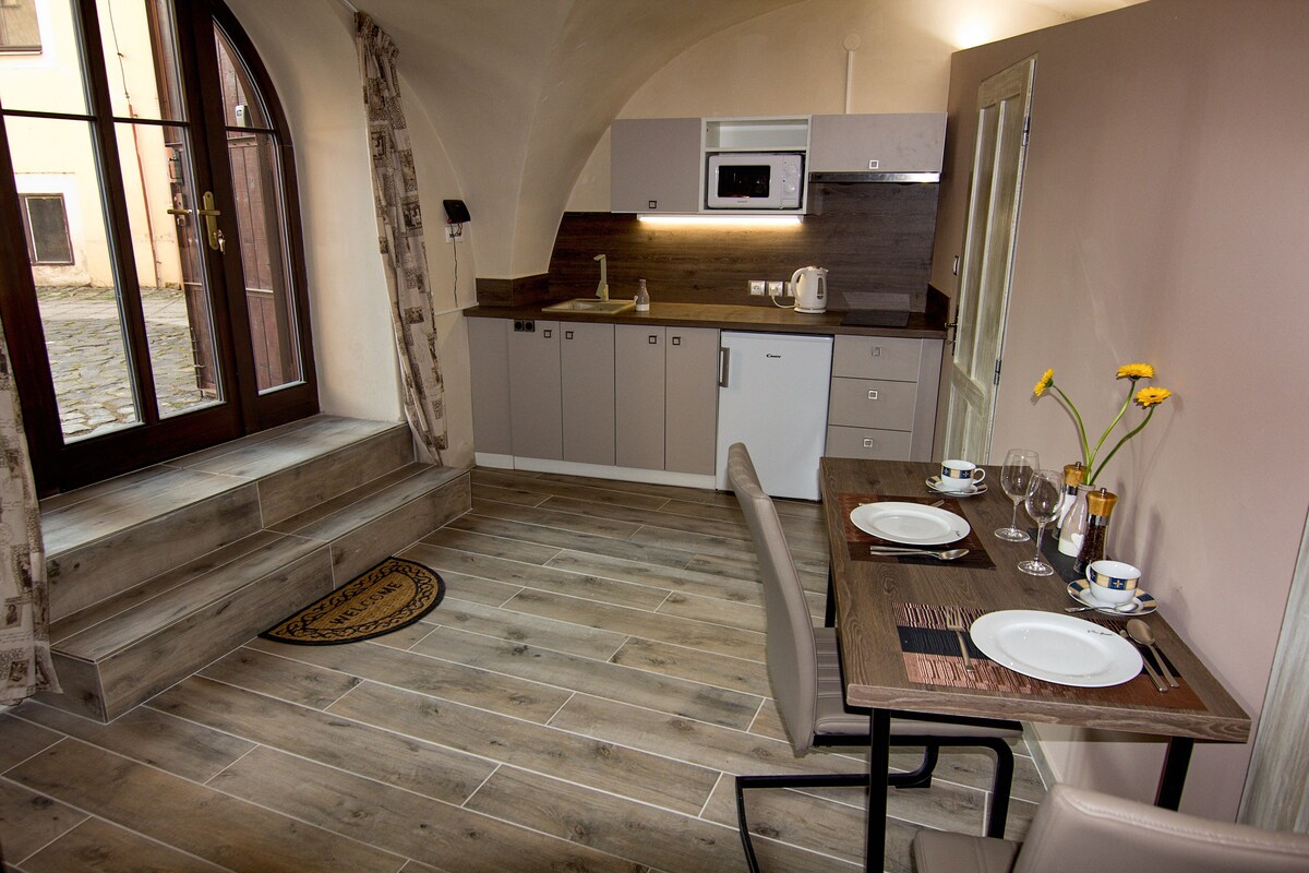 Zcela nově zrekonstruovaný apartmán se nachází v historickém památkově chráněném gotickém domě ze 14. století v samotném historickém centru Litoměřic. Osobitost apartmánu podtrhují původní klenby a designový interiér. V blízkém okolí naleznete restaurace, kavárny i obchod s potravinami (30m). Auto lze zaparkovat na placeném parkovišti přímo u apartmánu, dlouhodobější stání doporučujeme u autobusového a vlakového nádraží (500 m) za 10 Kč na den.