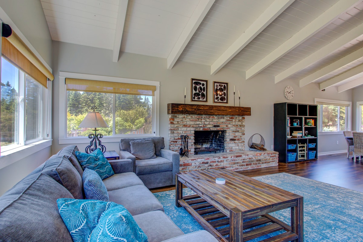 Escape to our serene Mendocino retreat! This modern, spacious 2-bed, 2-bath home comfortably fits 4. Features an open-plan living area with a cozy fireplace, a fully equipped kitchen, and a dedicated workspace. Relax in the large, grassy yard or in the soaking tub. Just a short drive from stunning cliffside trails and beaches. Your perfect coastal getaway awaits!