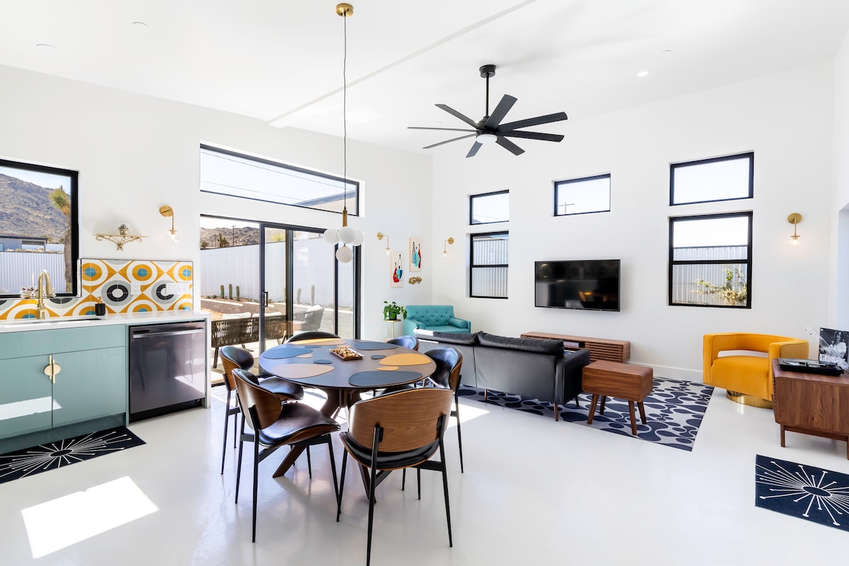 The Rum Runner. A modern take on the classic desert homesteader. Highlights include: -Hot Tub -BBQ Grill -Tesla Charger -Multiple Fire-pits -Parachute Linens -Sonos Sound System -Endless Desert Views -Multiple Cowboy Tubs -Fully Equipped Kitchen -Outdoor Stargazing Daybed -Large Shaded Patio with Outdoor Dining -Sun Room with 8x20’ Retractable Glass Wall -Indoor Mural designed by local artist Ana Digiallonardo