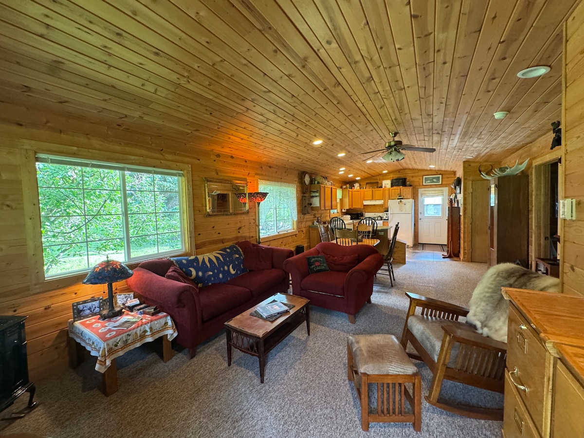 Tucked into the woods at the end of the road just 13 minutes from the heart of town, this cabin is a treasure. Cliff built the place himself; each tree sawn on his tractor-powered sawmill. We added family antiques, new mattresses and original art (lotsa comfort and love). The covered porch is high in the trees with breathtaking views 1000 feet above the Yellowstone River. A stellar location, you will be hard-pressed to find a more memorable authentic cabin experience during your Montana travels