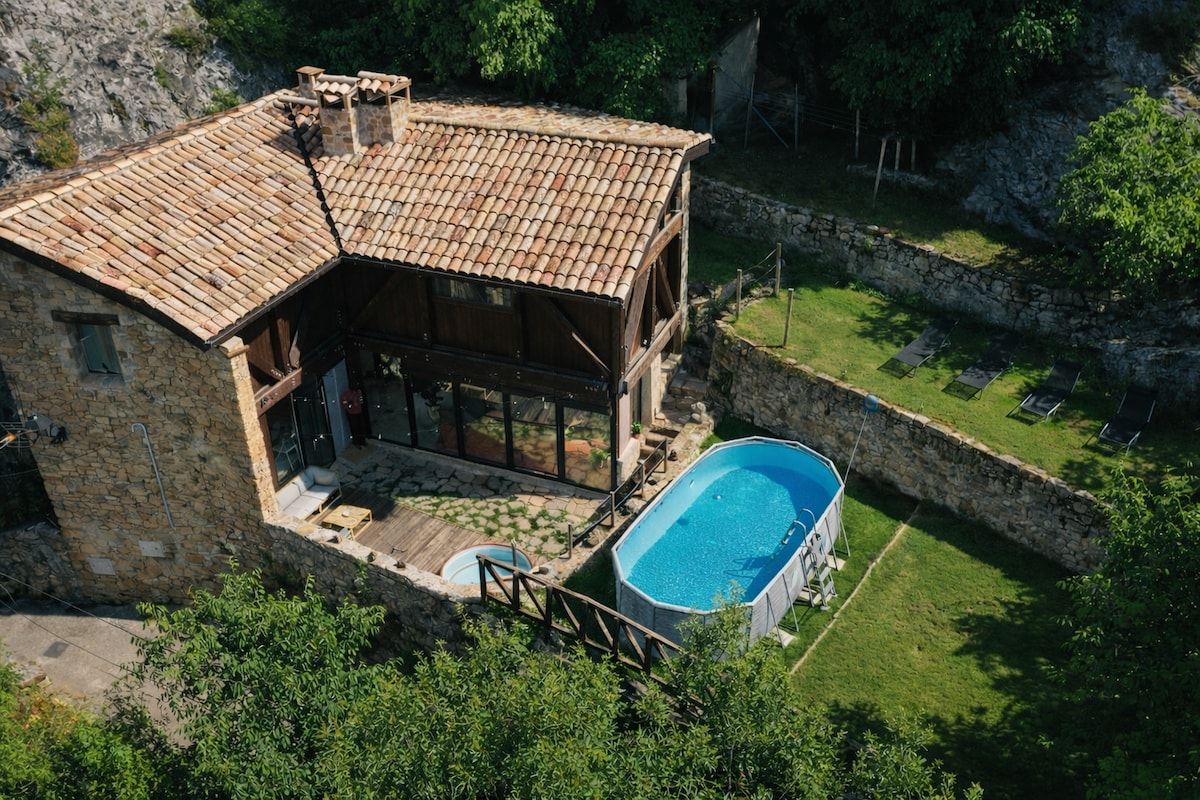 Tourism Registration HUTL000176 The Escola del Puig is a small house, surrounded by nature, ideal if you are looking for tranquility. In front of the house there is a lawn, garden furniture and barbecue. Next to the fenced enclosure with a private pool. It has a capacity of 2 to 4 people, ideal for couples or families with children. On the ground floor there is the kitchen-living room-dining room with fireplace and pellet stove. On the first floor, the two bedrooms with a large bed, along with the full bathroom.