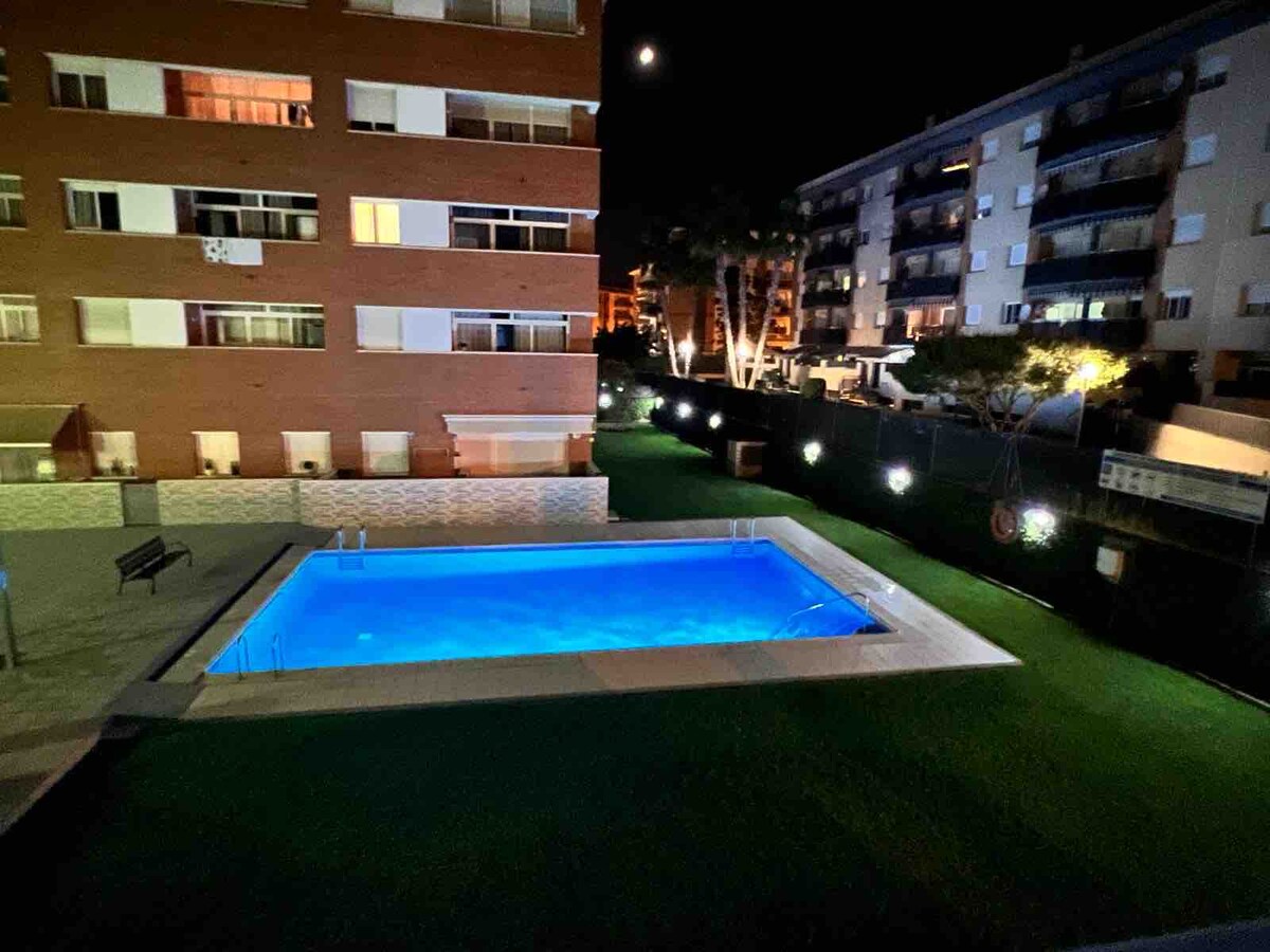 The apartment is very spacious with two bedrooms with lots of light, a separate kitchen with a fridge, oven, ceramic stovetop, microwave, washing machine, dishwasher, etc. bathroom with large bathtub and dining room with large terrace. 50 meters from the beach, close to supermarkets, bars, restaurants Very quiet area but with all amenities nearby