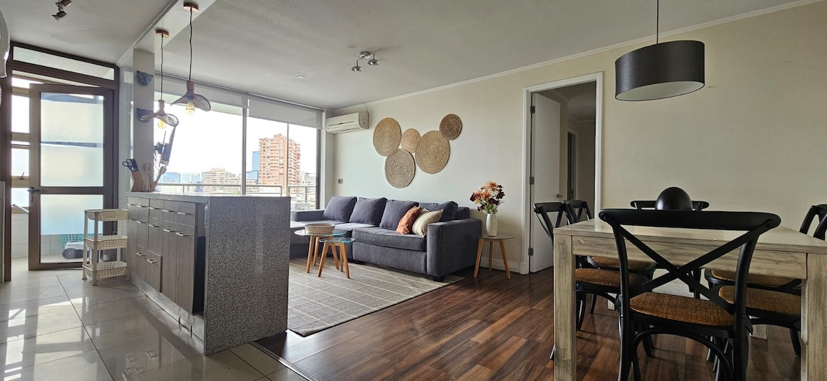 Modern apartment with spectacular mountain views, steps from the Parque Arauco Mall. Heated pool, gym, 24-hour security and parking. Two bedrooms, king bed + 2 single beds, double sofa bed in the living room, 2 bathrooms, enclosed terrace with window protection, ideal for families. Washer/dryer, dishwasher, high-speed Wi-Fi, and work desk. Fully equipped for comfortable, safe and functional stays.