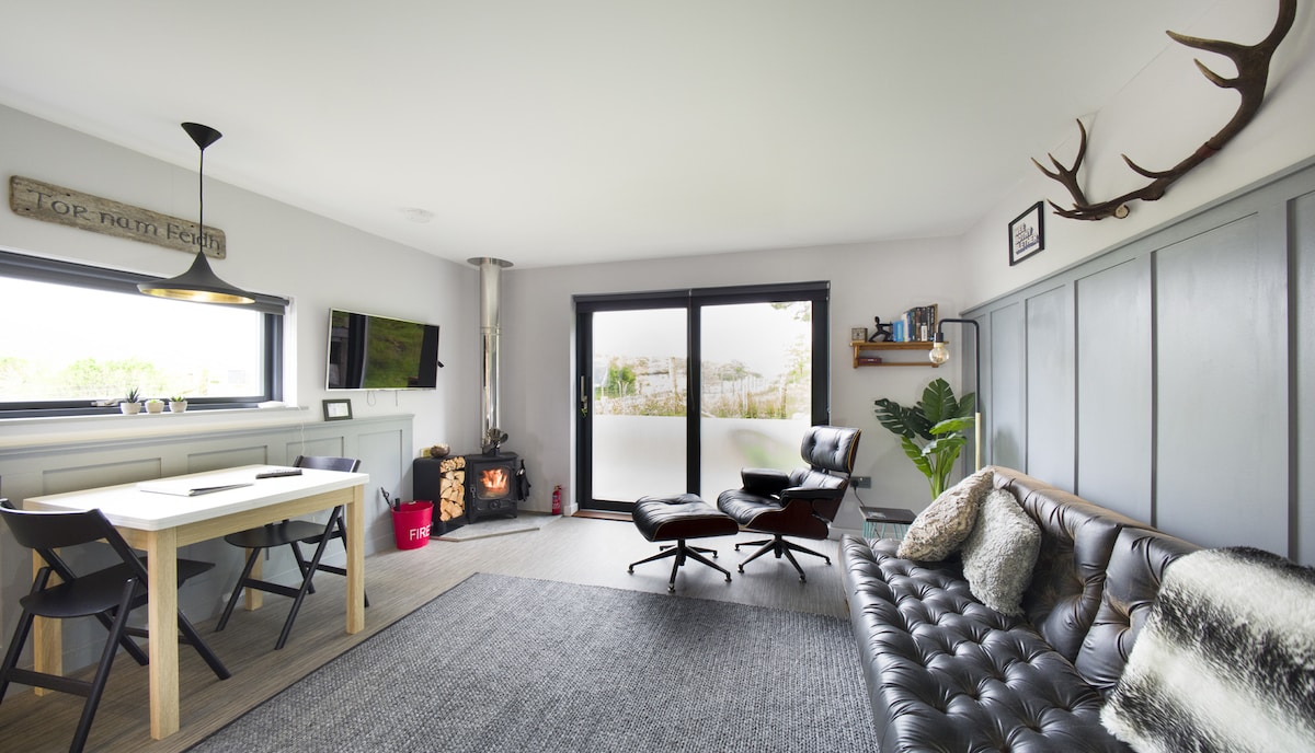 This unique place has a style all of its own. set on the top of a hill with stunning views over the sound of Sleat, taking in breathtaking views of the Isles of Eigg and Rum and in the distant the most westerly point of Scotland. Either sit and relax outside on the decking or down at the fire pit enjoying the peace and tranquility. Enjoy your relaxing break and cosy up inside with under floor heating through out and a warming glow from the log fire.