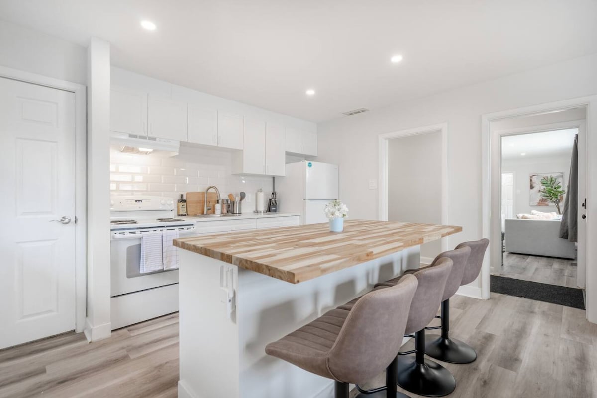 Welcome to our retreat in west London! This stylish Two-Level Basement Split is a guest suite ideal for friends and families. Our 1+Den has 2 comfy Queen Beds, 1.5 bathrooms, a large kitchenette with every appliance you need, and a foosball table for some competitive fun. Outside, there's a hot tub, firepit (BYO wood), BBQ, and outdoor eating area. We live upstairs and are available to assist with the indoor or outdoor amenities at any time!