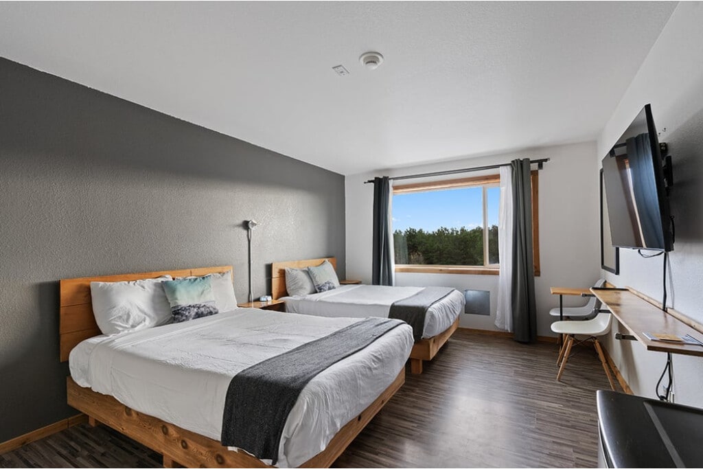 You’ll love the stylish décor of this charming motel. Newly remodeled, clean and modern. Come stay with us in comfort. Lower-level Double Queen Room with dining table. Complementary Wi-fi for all guests. Room features new cozy queen-sized beds, walk in shower, mini-fridge, microwave, TV streaming, complimentary bottled water, and award-winning coffee. Pet-friendly room. Pets must be on reservation. Pet fee is $30 Check us out online for reviews and updated information.