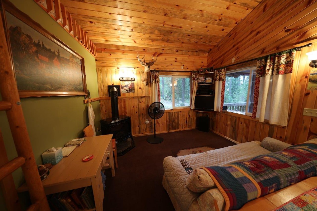 This cozy 640 sq. ft red log cabin is tucked up in the woods. The bedroom has queen bed. A 200 sq. ft loft has a queen and 2 twins, accessed by ladder (see pic). Full kitchen & BBQ (electric). 3/4 bath (shower). 32" Flat screen, Blu-ray, stereo. Romantic gas fireplace. Limited WiFi & cell coverage, come unwind, relax & recharge. Covered deck offers excellent wildlife observation. Owners have large people-friendly dogs, so no pets allowed. In winter, 4WD vehicle or chains strongly advised.