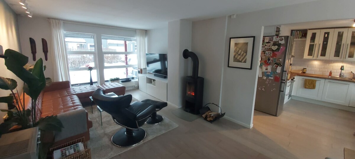 In this place you and your family can stay close to everything, the location is very central! See map. Nice and bright well-equipped 3 rooms with a total of 4 good beds. Washing machine/dryer as well as integrated appliances (dishwasher, microwave ++). Balanced ventilation system ensures a good indoor climate. Waterborne underfloor heating in all rooms. Ironing board and iron, hairdryer ++ Electronic lock for easier check-in. Private terrace and barbecue that can be enjoyed on warmer days. No pets allowed.