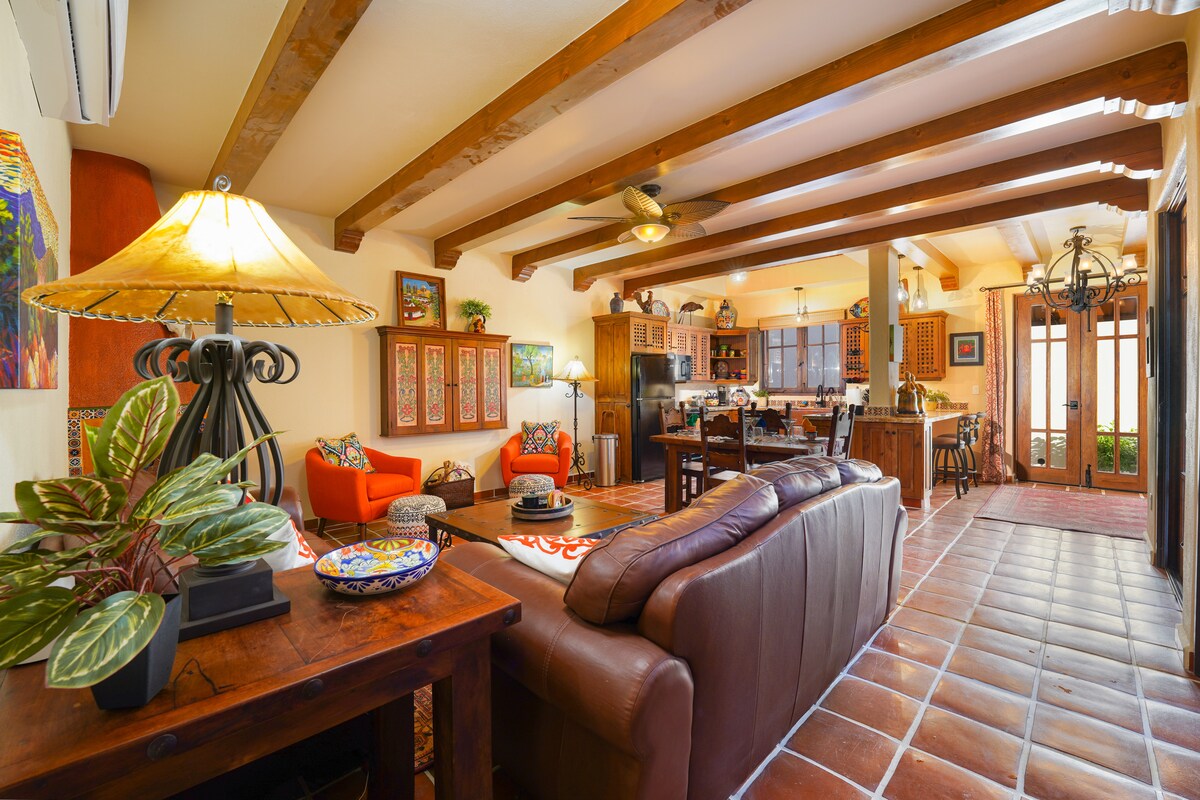The whole group will enjoy access to everything from this centrally located place 2 blocks from the malecón and 1/2 a block from downtown plaza with restaurants Private 2 unit compound with secure parking First unit is a 1/1 bedroom Second unit 2/2 all with full kitchens and has fire places Equipped with a heated/chilled pool and bar, brick sauna, lawn area, fruit trees, outside horno, bbq area, full of local art work with rancho style furniture and local historically designed architecture