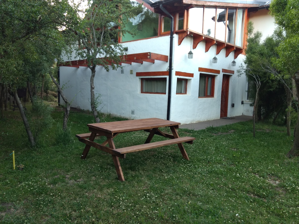 Loft-style house in the Las Balsas neighborhood, surrounded by nature and just 10 minutes from downtown. On the ground floor there is an equipped kitchen, dining room, living room with Smart TV and full bathroom. Upstairs, open room with king-size bed and blackout. Ideal for relaxing with privacy and style. Wi-Fi, covered parking and a quiet environment to reconnect. A comfortable and serene experience in Villa La Angostura.