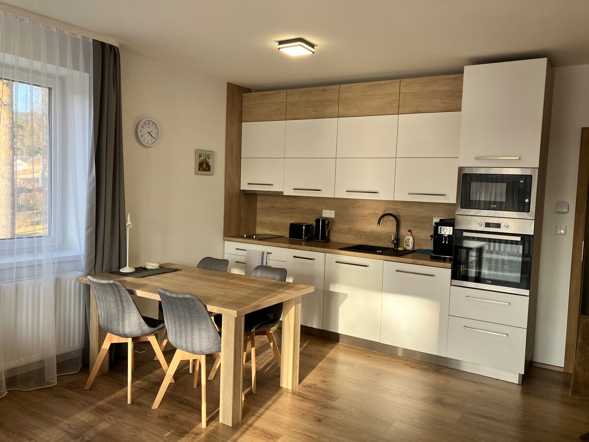 The apartment is close to a game reserve with deer and yet close to the amenities of the village of Lipno nad Vltavou. Here, nothing will disturb you and you can listen to the sounds of nature. Evenings at sunset on a spacious terrace or in the warmth of the fireplace with a cup of good coffee. We welcome families with children, we have a crib, changing table, high chair and the like. For bad days, there is an x box, but children will enjoy the forest the most, which you can see directly from the terrace.