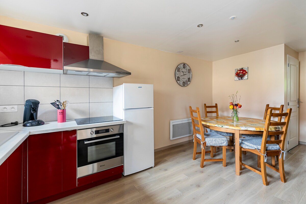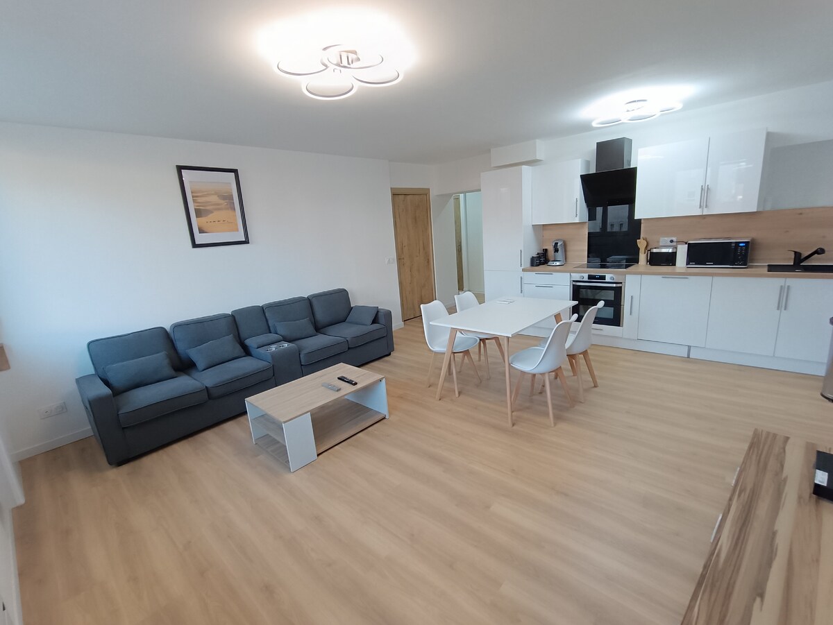 Welcome to La Tanière du Loup, listing 1 50 m2 apartment renovated in 2020, furnished and equipped with all the necessities to make your stay feel like home. Located in a quiet and relaxing area. Access is independent with a terrace and private parking (parking has video surveillance) Kitchen equipped with appliances Living room: sofa bed 140/200, Orange TV and Netflix included Bedroom 1 double bed 180/190 Equipped bathroom: hair dryer, towels, etc.
