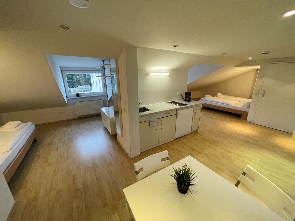 In a quiet central residential area in Arnstorf, we have two guest houses with a total of 15 apartments. The apartments are equipped with a sleeping area, a living area with a sofa and fully equipped kitchenette and a bathroom with shower. A flat-screen TV, free Wi-Fi, towels, bed linens and a weekly cleaning were among the basic amenities.
