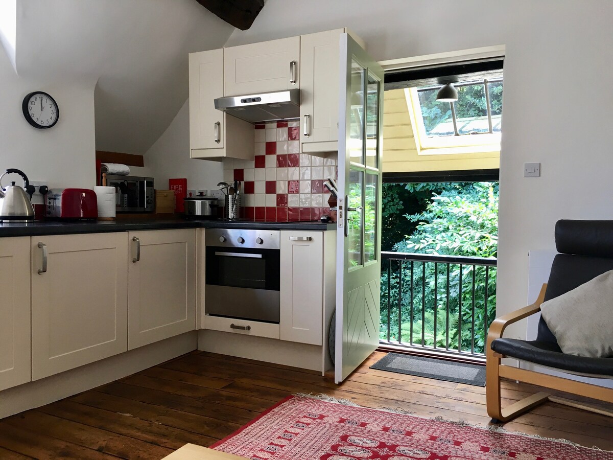This expertly refurbished 19th-century Coach House is full of character and all ready for your luxurious relaxing break. The open-plan living area has a exceptional view, and when you want a change there's a large smart TV and good-quality broadband for entertainment. The kitchen comes with induction hob and oven, dishwasher and washing machine, as well as all the pots, pans & utensils you need for cooking up delicious meals. The shower room/toilet is conveniently tucked away in a corner. Walk up the distinctive oak staircase to find the upstairs bedroom, with its impressive round window. It sleeps up to three people in a kingsize double bed and a separate single, and there's also room for a travel cot for an infant.The Coach House is ideal for a couple on a romantic escape, or for a family with young children looking for a safe space to relax and play. KEY FEATURES - One bedroom – upstairs, with kingsize double and single bed, space for travel cot. - One shower room/toilet – downstairs. - Sleeps up to three, and infant. - Private outside terrace area with view, shared use of 1.5 acre secure meadow & gardens. - Dogs welcome, two maximum, small additional charge. - Young children welcome (but you may need to bring a stairgate for safety). - Smart TV (Netflix, iPlayer, Freesat etc). - Good-quality broadband/Wi-Fi (free). - Induction hob, oven, microwave, fridge (freezer available if required), dishwasher. - Dining table for four, two leather sofas. - Washing machine (and use of dryer if required). - Underfloor heating (powered by eco-friendly air source heat pumps). - Wood burner, first basket of logs free. The Coach House is bookable by the week (start day Friday), and for weekend and mid-week short breaks.