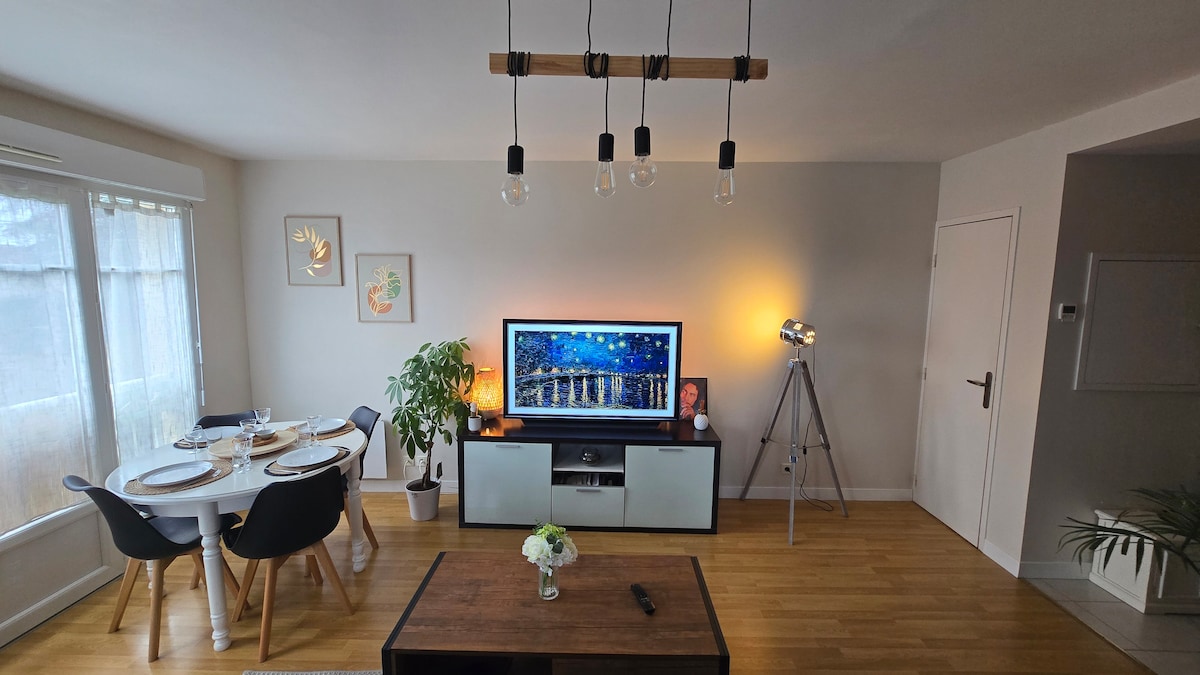Discover our charming accommodation on the banks of the Indre! Free parking. 7-min walk to Place Monestier with bars and restaurants. Recently renovated and beautifully decorated, it offers a large QUEEN SIZE bed, 2 televisions with Orange TV and NETFLIX, a NESPRESSO coffee machine (pods provided), a washing machine (laundry provided) and a dishwasher (pods provided). Book now to enjoy a unique experience in Châteauroux. Fiber Wi-Fi. Pets allowed.