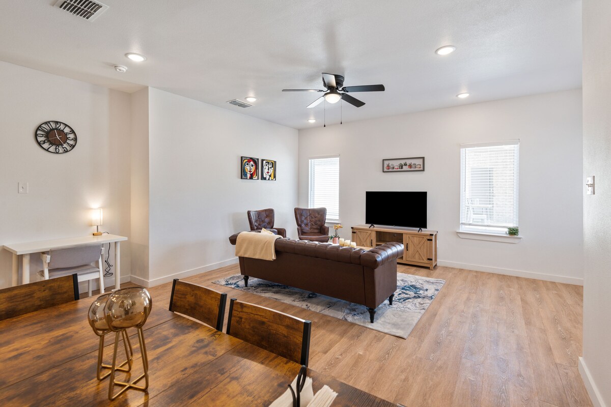 Newly remodeled bathroom, kitchen, new windows and floors, plus new living room furniture! This 3/2/2 smart home features EV charger, memory foam beds, adjustable bed in Master suite, 50" smart TVs, 1Gb Wi-Fi, 2 work spaces with electric sit / stand desks. Keurig, stocked kitchen, toiletries, hot/cold filtered h2O, MyQ garage remote app and more to help you feel at home. A 5 minute drive gets you to Texas Tech, UMC, Covenant hospitas, and Buddy Holly Hall. Weekly / monthly discounts available.