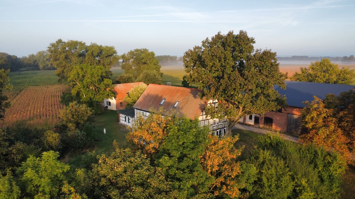 Forget everyday life in this quiet space in the Elbtalaue Biosphere Reserve. The half-timbered house is located on our 6,500 sqm property on the outskirts of Sumte. It was completely renovated in 2022-2023 and furnished with a lot of love for detail. Feel free to use our garden, make a fire pit, admire the sunset from the terrace or make yourself comfortable inside on 100 square meters. We have plenty of tips ready for you to discover here.