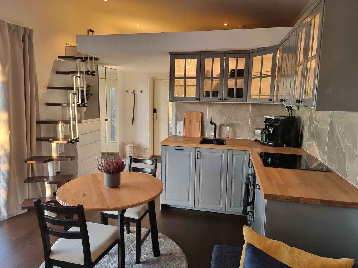 In a separate house is our apartment, which is about 35 square meters on the ground floor. Fully equipped kitchen with fridge/freezer, microwave, oven and cooking facilities. Toilet w shower. Bedroom with 3 places in bunk bed. (Lower bed 120 x 200) Upper bed (90x200) Living room with sofa bed for two. (140x190) Travel bed. The apartment has WiFi and TV included. Wifi and high-speed wired internet are available for a fee. Adjacent to the apartment is a laundry room with a drying room. Parking next to the accommodation.