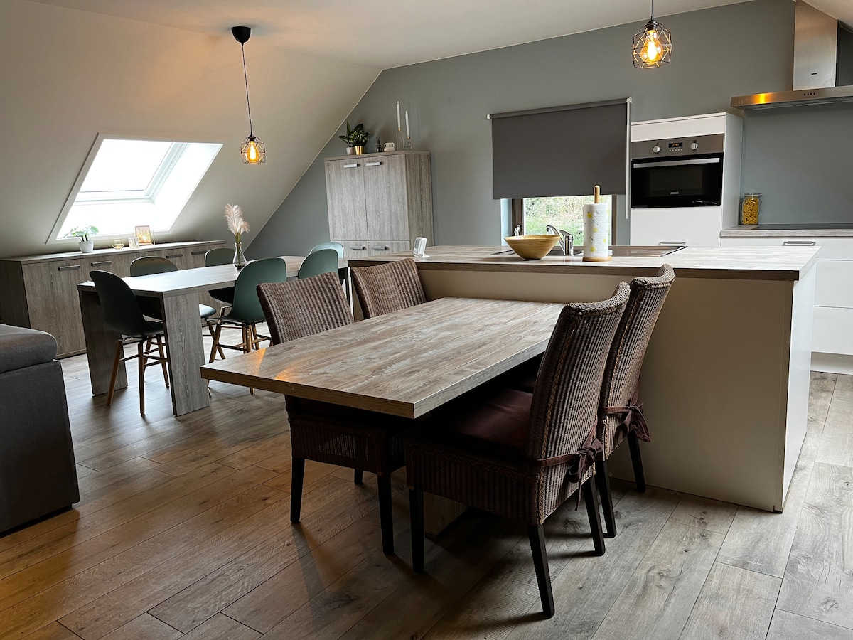 Modern ingericht appartement aansluitend aan de hoofdwoning met aparte ingang. Midden in het groen gelegen met mooie wandelpaden en mountainbikenetwerk in de buurt. 1 slaapkamer met queensize bed,2 kamers met kingsize bedden. Reisbedje voor kind is voorzien. In de living staat een grote hoekbank en eetgelegenheid voor 10 personen. In de tuin heb je zicht op de paarden... Apart terras met loungeset Verhuur van 2 elektrische fietsen ter plaatse. BBQ & uitgebreid ontbijt op aanvraag mogelijk.
