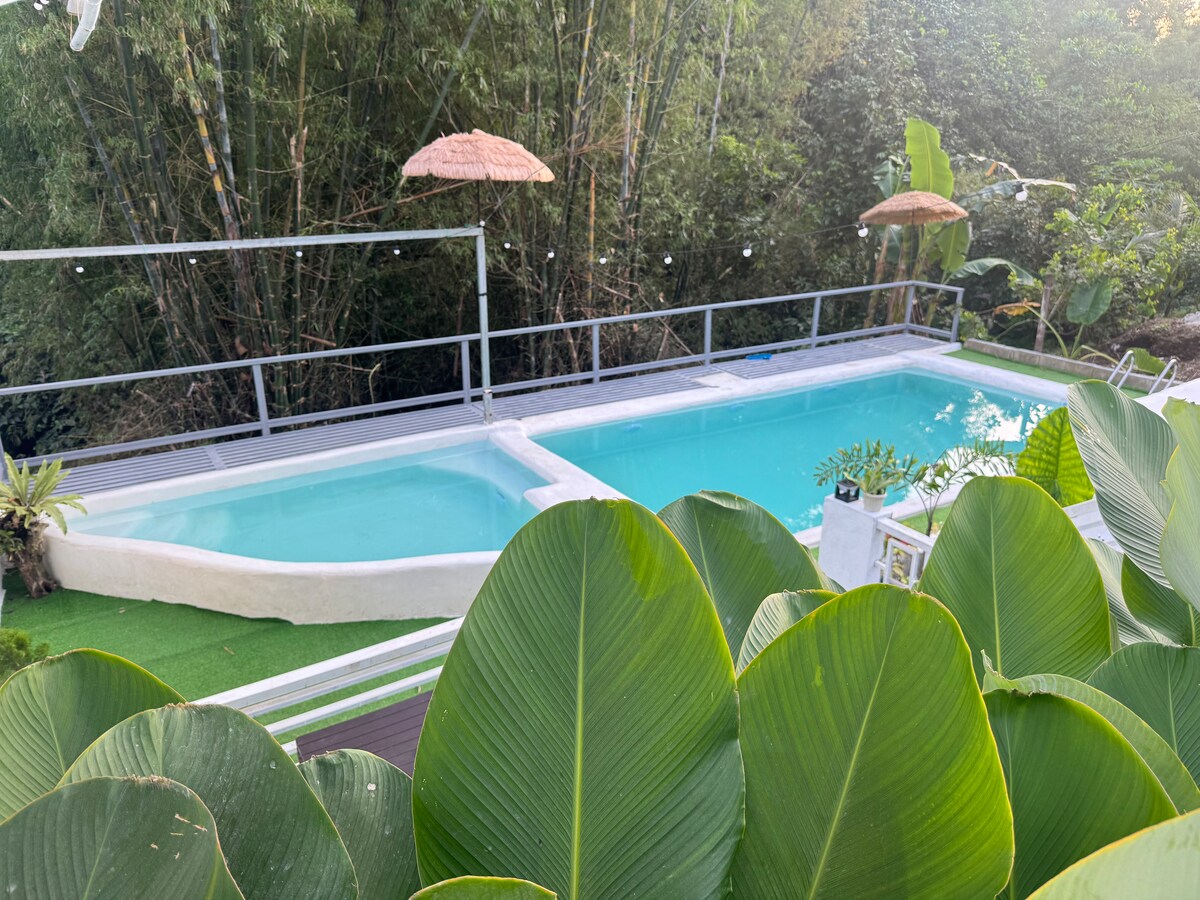 Experience nature's beauty with the comforts of home! Each tent has 1 queen bed + 2 singles, AC, fan, electrical sockets, and towels for a comfortable stay. Private bathrooms with toilet and shower are only steps away. We also have one room with a double bed, sofa bed and ensuite bathroom. Enjoy a pool, fire pit, ping pong table, grill, complete kitchen, Starlink Wifi and the best views of Mt. Batulao. *For groups exceeding 16, let us know, as we can adjust the total to accommodate up to 24.