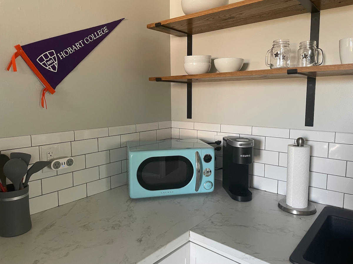 Enjoy a stylish experience at this centrally-located apartment. Newly renovated unit in the heart of Geneva. Walking distance to Hobart and William Smith Colleges, Wegmans, Coffee shops, etc. A perfect spot for a wine-tour weekend in the Finger Lakes. One spacious bedroom with queen bed. Ottoman pulls out to twin sized bed for additional sleeping accommodations. Full kitchen to meet your needs for longer stays. Nestled on the first floor of a well kept beautiful historic residential building.