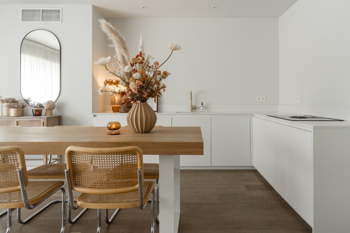 This modern vacation home has all the assets to offer you a great vacation: cozy, comfortable, stylish and artistically decorated, with artisanal tableware, a lovely rain shower, a beautiful private terrace in the countryside. Quiet location in the vicinity of nature reserve de Maten, the bicycle route network, and the Bokrijk domain. You can soak up culture, dine or shop in Genk and Hasselt. The host is a ceramist and is happy to explain her craft in her studio.