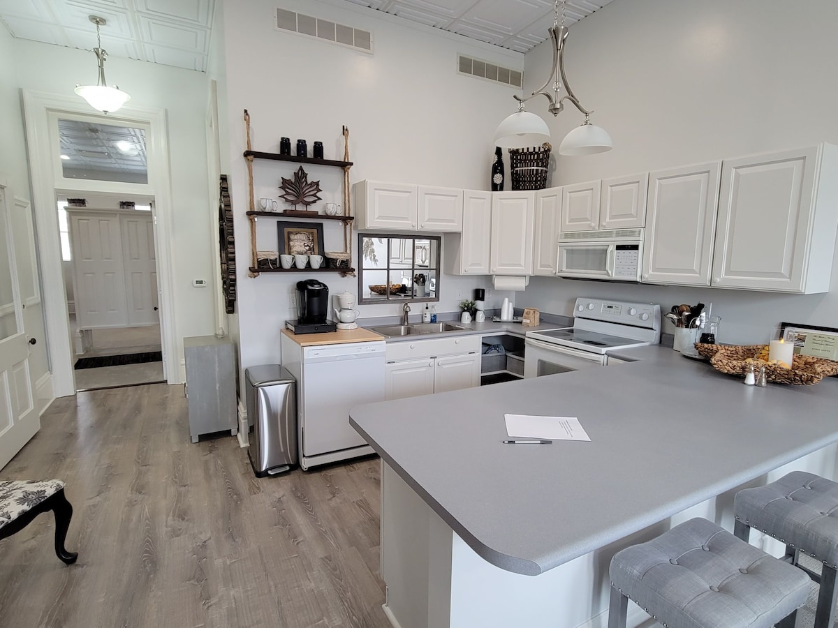 This elevated second story apartment has an incredible view of the historic downtown square and courthouse. Bring your group to be in a centralized location near dining/bars , shopping, museums, and a movie theatre. Accommodations for a group of seven is ideal for getaways or special occasions. The unique relief art sculpture of a tree and eagles will captivate you. A full kitchen with all the essentials. 6 beds and spacious 3/4 bath and a second 3/4 bath opened for 5 or more guests.