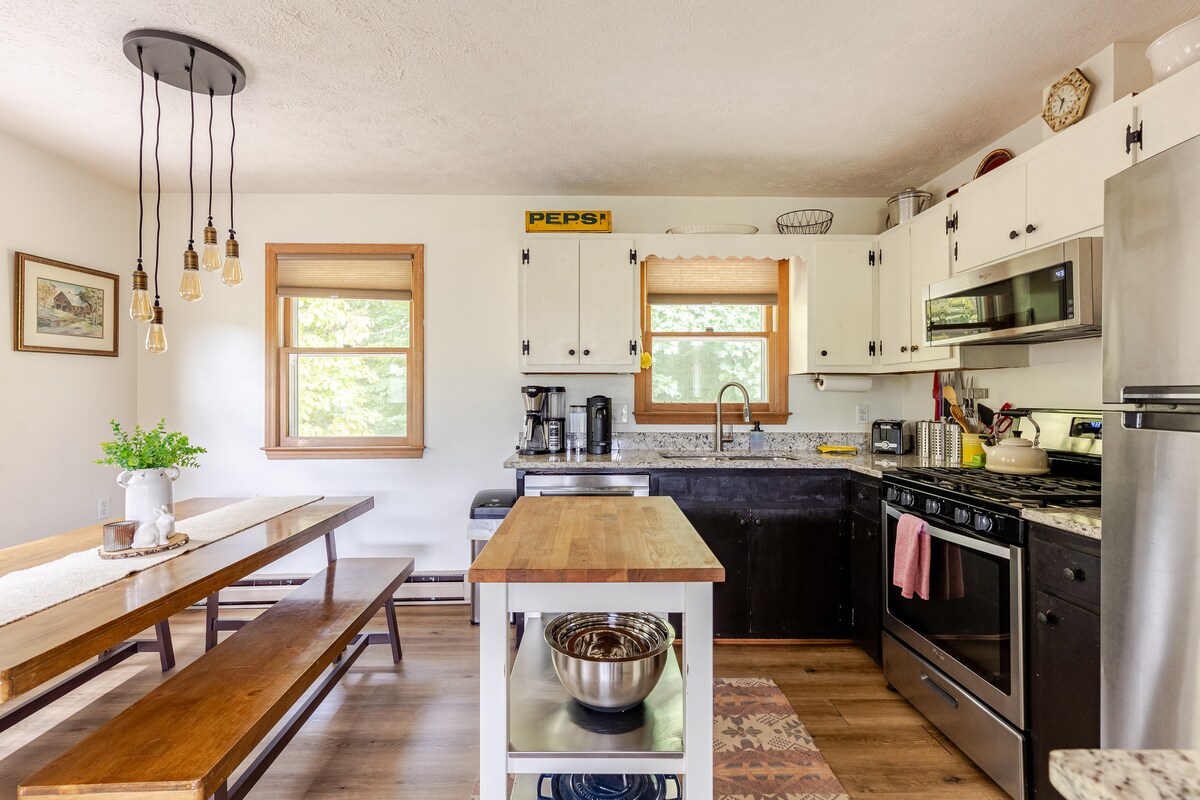 Our charming and private cottage is perfect for your Blue Ridge retreat! This 1950s cabin has been fully updated but retains its quaint midcentury mountain charm. Minutes from the amenities of Cashiers, Highlands, and Lake Glenville, you'll be treated to lake and mountain views, a spacious front porch, a backyard fire pit, a vintage wood-burning stove, and a cozy bedroom. The kitchen is equipped with all the utensils you'll need to prepare meals as well as coffee appliances.