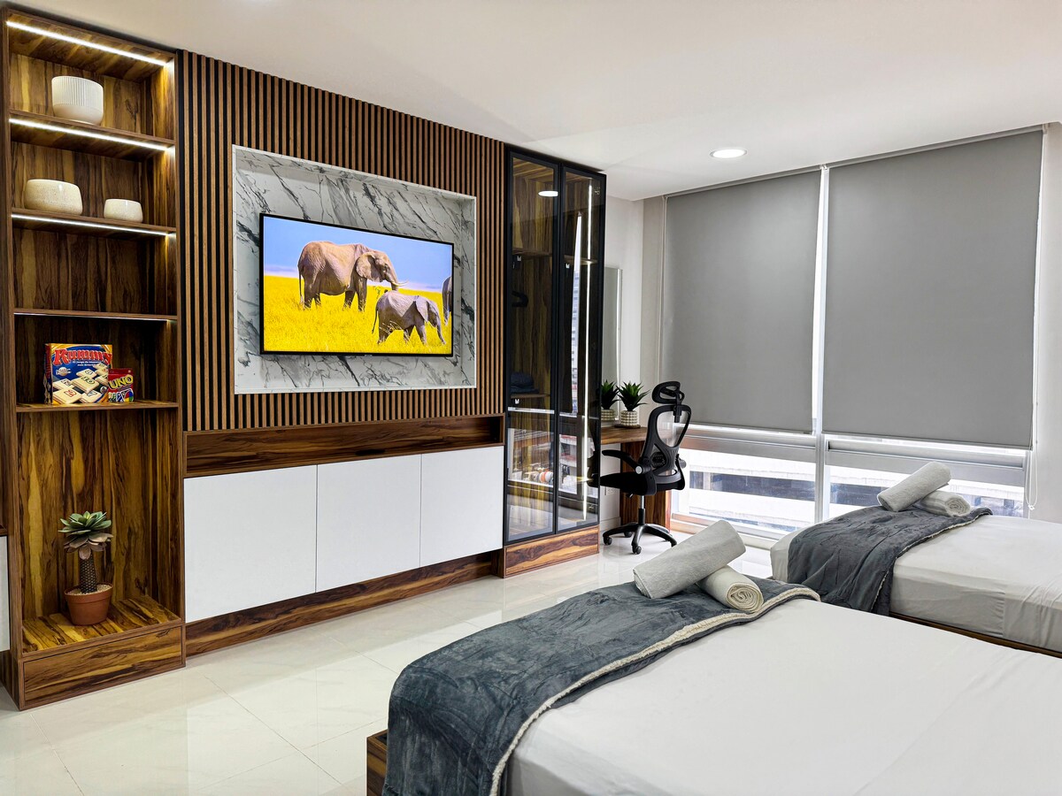 Welcome to Inner Tower Experience downtown Monterrey in our apartment with exceptional finishes and a view of the city skyline. A unique location! Wi-Fi, Smart TV, air-conditioning, 1 parking space. Ideal for executives, families, and tourists. 24/7 security, 3 elevators, EXCELLENT AMENITIES. You can walk to the Macro Plaza, where you'll find quick access to Cintermex and Arena Monterrey. 2 full bathrooms and 2 bedrooms with 4 beds for 5 people and a sofa.