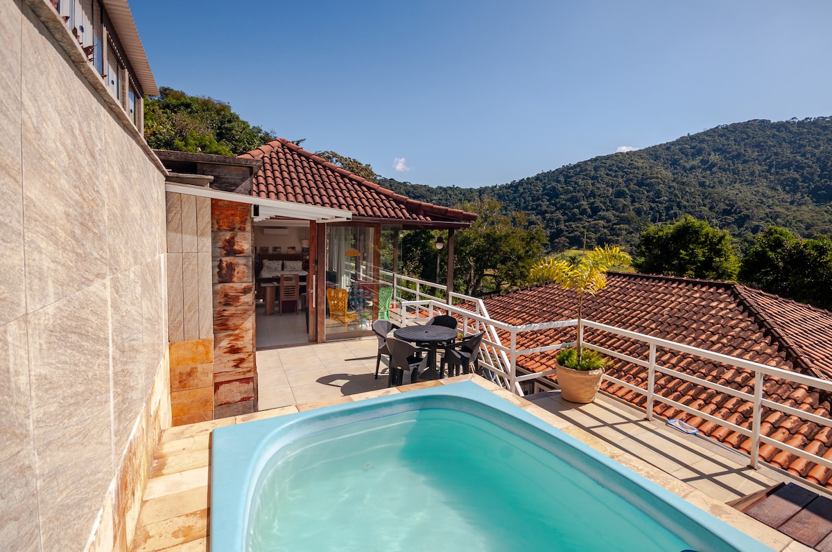 Rustic 2-story loft in the middle of the Atlantic Forest. Stunning view, beautiful sunset. Eucalyptus construction and decorated with rustic furniture, cozy, balcony with heated Jacuzzi, full American kitchen, living room, toilet and mezzanine with double bed and a bathroom. Quiet space for those who want to escape the city. Close to Grumari Beach and trails. Gastronomic hub of seafood. heated jacuzzi with lighting and breathtaking sunset views