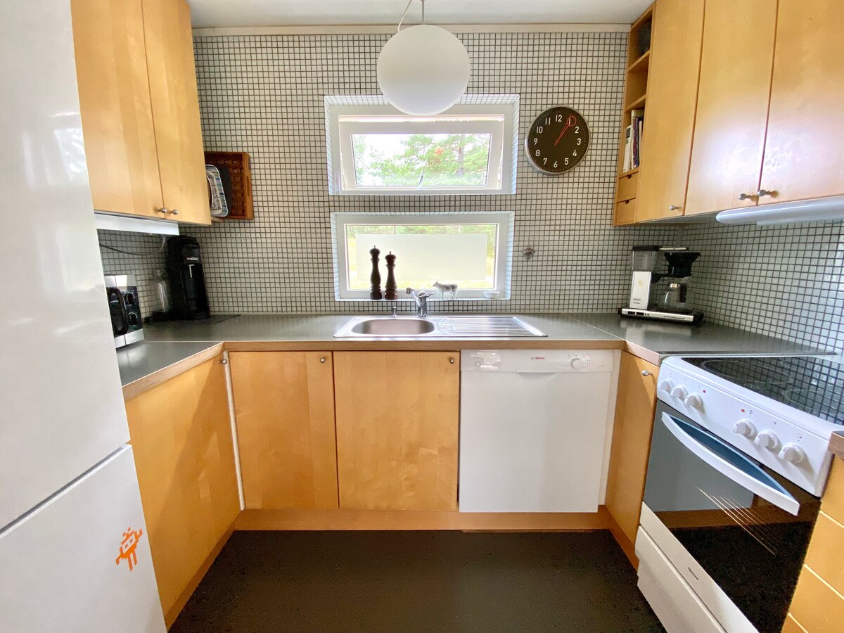 Architect-designed summer paradise near the sea. The accommodation consists of 2 houses, one of which contains a bedroom, kitchen, living room with fireplace, shower/toilet. In the second house, there are 3 bedrooms, shower and toilet plus a laundry room. Around the houses, there is a wooden deck and a large garden overlooking the field and evening sun. A short walk through a fabulous nature reserve leads you down to a 30 km white sandy beach. A lovely and peaceful accommodation all year round. Warm welcome from the Bristulf Jones family