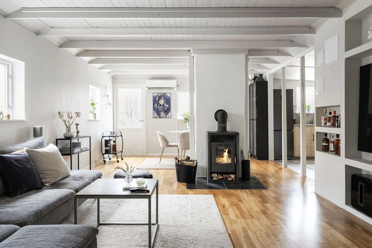 Designed & furnished with a touch of luxury ideal for couples and family holidays set in beautiful countryside with Ystad Centre & fabulous sandy beaches just 2/3k away plus all southern Sweden within easy reach You have Remote Control for Air Conditioning & Heating to ensure total comfort in summer or winter WIFI via Optical Fibre internet is reliable & fast. The garden has comfortable seating & dining for 6 plus barbecue Ystad by car 5min or cycle 10min 1k to an ICA supermarket 7am-10pm 7 days