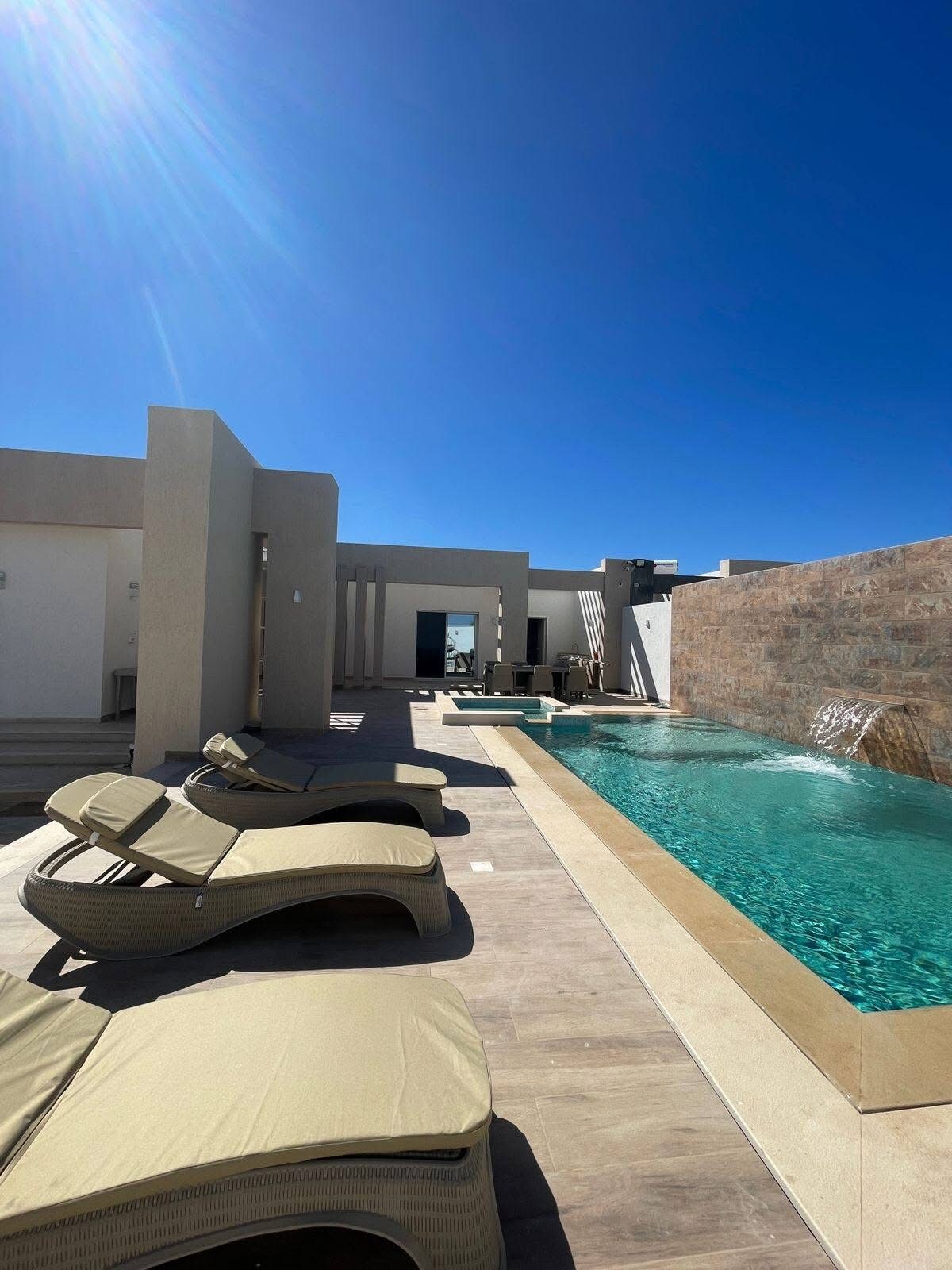 Luxurious villa located in a chic and secure development, surrounded by century-old olive trees and palm trees. The villa is close to all amenities: 5km from the center of Midoun, a few minutes from the most beautiful beaches on the island and close to tourist activities. Modern villa on one level with clean lines, fully air-conditioned with a large swimming pool. Layout open to the outside with excellent light. There reigns calm, serenity and well-being.