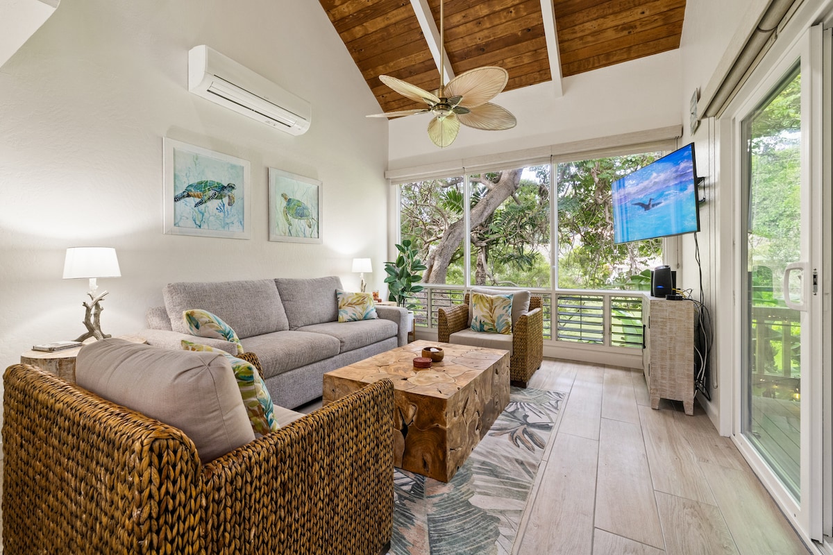 One-of-a-kind tropical retreat in a lush, secluded 7.6-acre crater with 15 Polynesian-style duplexes in sunny Poipu. Walk 10 mins to Brennecke’s, Poipu, and Shipwrecks beaches. Private crater with pool, tennis, chipping green, clubhouse, BBQs & ping pong. Recently updated with new floors, 62” Koa fans, fresh paint & Hawaiian wallpaper. A true tropical paradise great for couples, friends and family.