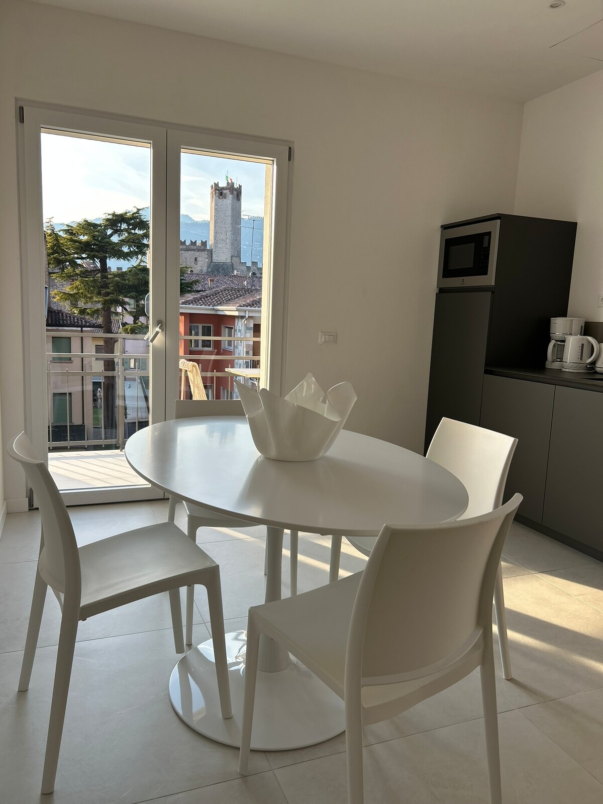 Enjoy our house, a design apartment where iconic pieces of furniture merge together with vintage touches. Recently refurbished, it offers three large bedrooms with independent bathrooms. On the first floor a large balcony offers a view over Garda and the Rocca (hill). On the second floor a wide glass window creates a unique environment between the open living room, the terrace, the sky and the lake. 5 minutes walk from the lake, our apartment provides an exclusive permanent parking space.