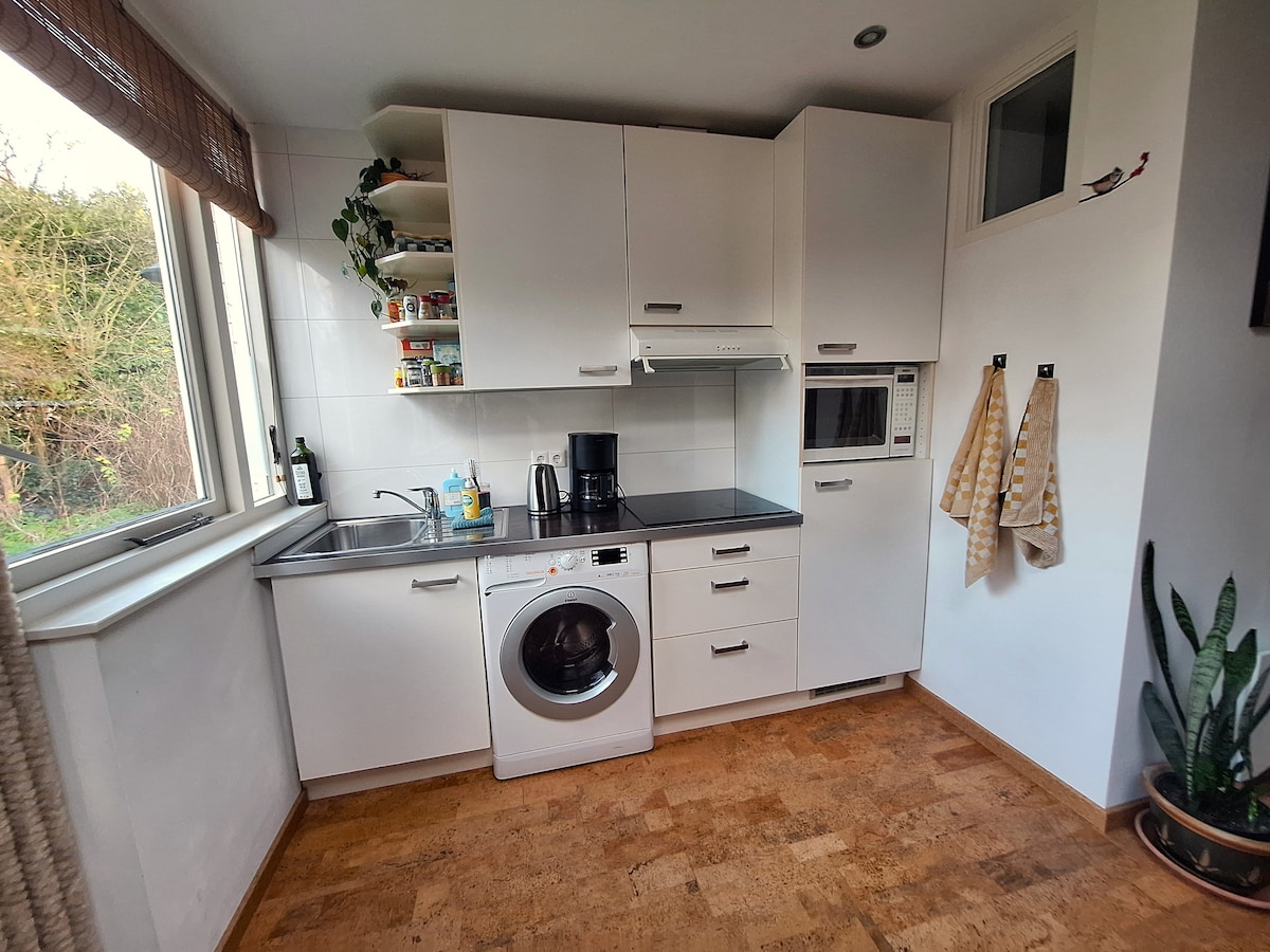 'Hier is 't - Cozy house' - independent space in a detached house, Nijmegen. Breakfast €8,- at 'Mr. Vos'. Extra bed for 3rd person. Close to Goffertpark, hospitals, HAN/Radboud, shopping center and nature. The city center can be reached by bicycle and bus. Ground floor with private entrance. Free parking in the street. 'Tiny house' has all the amenities for an independent stay. Common areas: 'garden room with lounge + minibar', beautiful garden and sitting area with fire pit and BBQ.