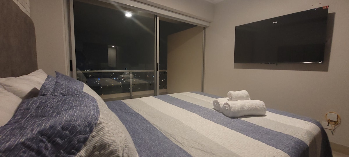 Brand new modern loft, very well located and with incredible panoramic view from the 35th floor. Easy access to main avenues, shopping centers, museum, train, financial center, clinics, gyms, parks. It has a laundry room, master bathroom, kitchenette, equipped kitchen, walk-in closet, hot water, TV, and Wi-Fi. Common areas: city viewpoint, rooftop, co-working. Close to tourist districts such as Miraflores, Barranco and Lima's Historic Center.