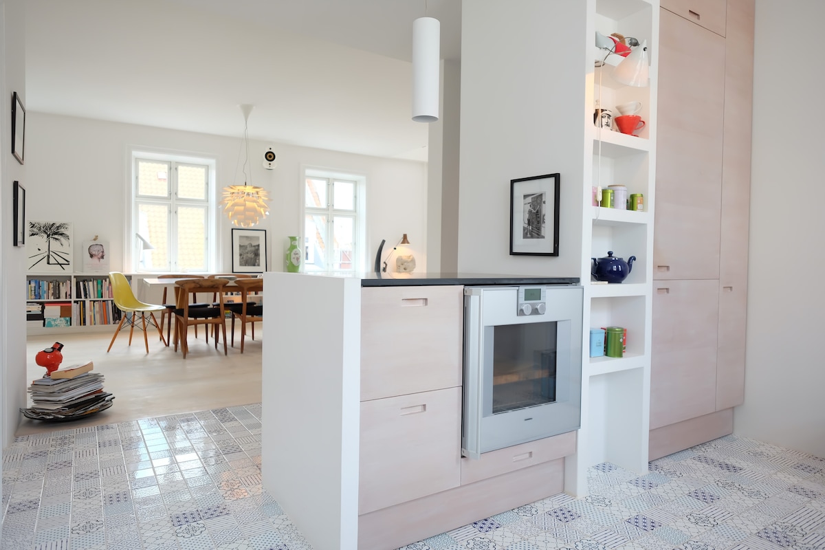 My apartment is situated on the third floor of a 300-year-old heritage building. It's important to note that, there is no elevator, which is common as less than 9 percent of buildings in Copenhagen's inner city have elevators. Keep this in mind if you have heavy luggage. My newly refurbished apartment features a hallway leading to the bathroom and a living room that opens to the sleeping area and kitchen. It offers a cozy (Hyggeligt) view of the city's rooftops.