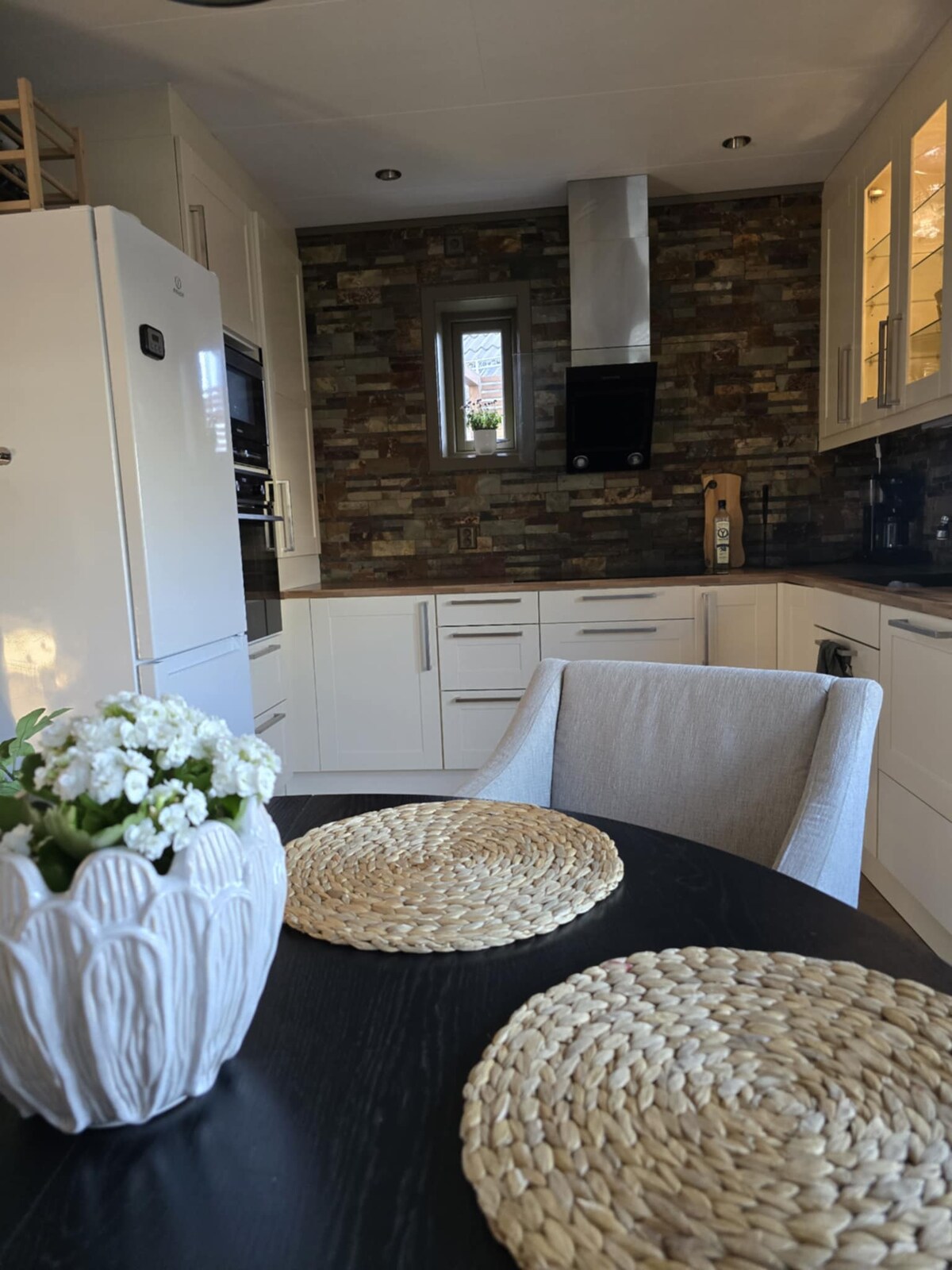 Central terraced house with 3 bedrooms and 1 bathroom. New kitchen (2022). TV with chromecast in all bedrooms and living room. Several zones outdoors with good sunny conditions. Spacious living spaces. Wood stove. Broadband (fibre). Free parking. Walking distance to: Stjørdalshallen / Turnhallen 550 m Kimen cultural center 1100 m Stjørdal station 1600 m 8-10 min drive from Trondheim Airport Værnes.