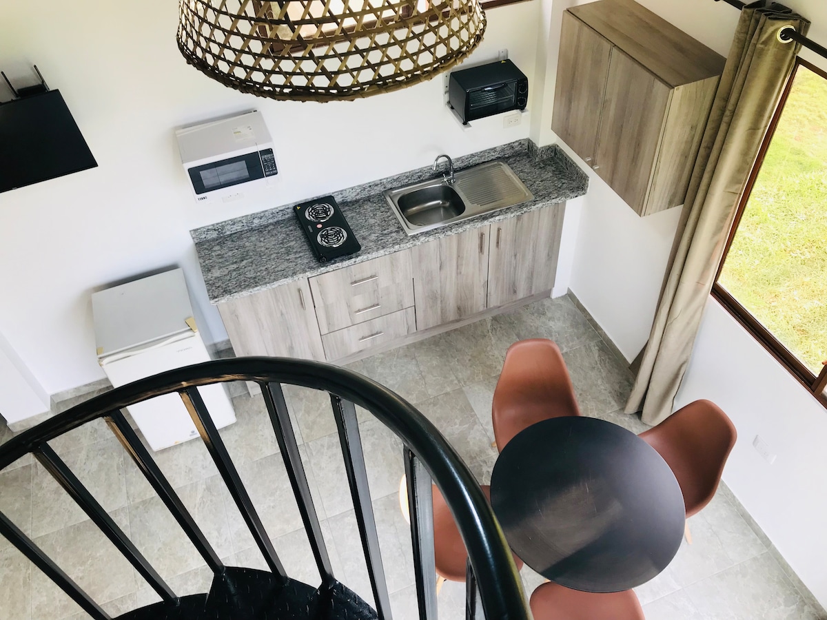 Connect with nature at this unforgettable getaway. A double-height loft house without spaces, with a mezzanine. On the ground floor there is a three-seater bed, the equipped kitchen, bathroom with electric heater, dining table, Smart TV with cable. It connects to the mezzanine with a beautiful spiral staircase. The upper part has a double bed and a 1.5-seater bed. Air split with capacity for the entire loft and outdoor shower. Parking and 24-hour security.