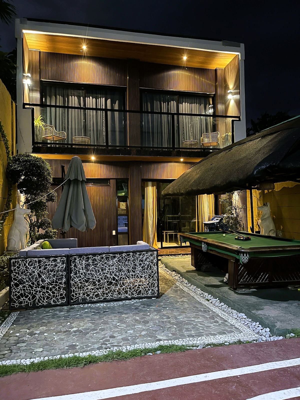 Book your private stay in this Modern Tropical Villa’s 1st floor with your exclusive swimming pool with jet spa finished in premium natural green Sukabumi stone. It has 2 bedrooms with ensuite bathrooms and air conditioning. Be entertained by our karaoke machine and huge tv. You will have a wide-open living area that opens to the outdoors where your dining area and kitchen is. It is ideal for small group and family staycation. Need more rooms? upgrade to the 2nd floor for a perfect stay!