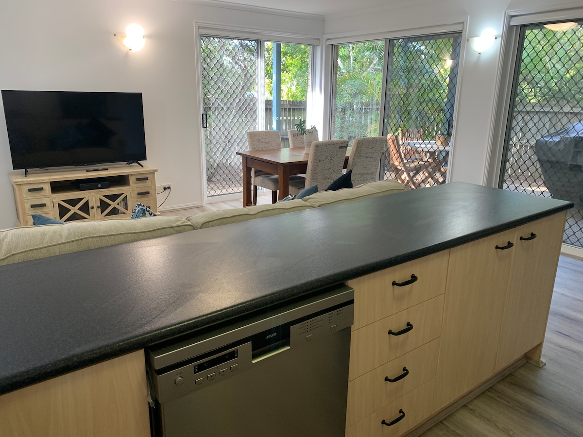 Quiet, light and airy large two-bedroom apartment in Thorneside surrounded by parkland and backing onto the train line. This has recently been built, although some areas are still a work-in-progress that we are working hard to finish. Close to the train station for journeys into Brisbane City or out to the Bayside. Please note there is some noise from the trains. Ideal for one or two couples, a couple with young children or solo travellers.
