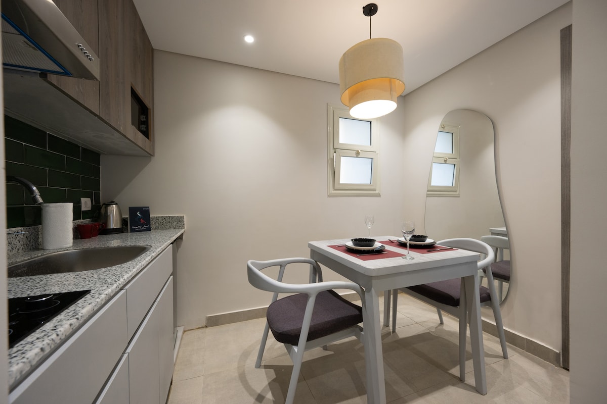Welcome to one of our three exceptional studios, nestled in the elite neighborhood of Degla, Maadi. Designed by a talented interior designer, this studio harmoniously blends coziness, elegance, privacy, and creativity in a way that only a true professional can achieve. Every inch of this home has been crafted with care, offering a warm, inviting ambiance that feels like it was made just for you. It's truly magical. Please take a moment to review our house rules carefully before booking.
